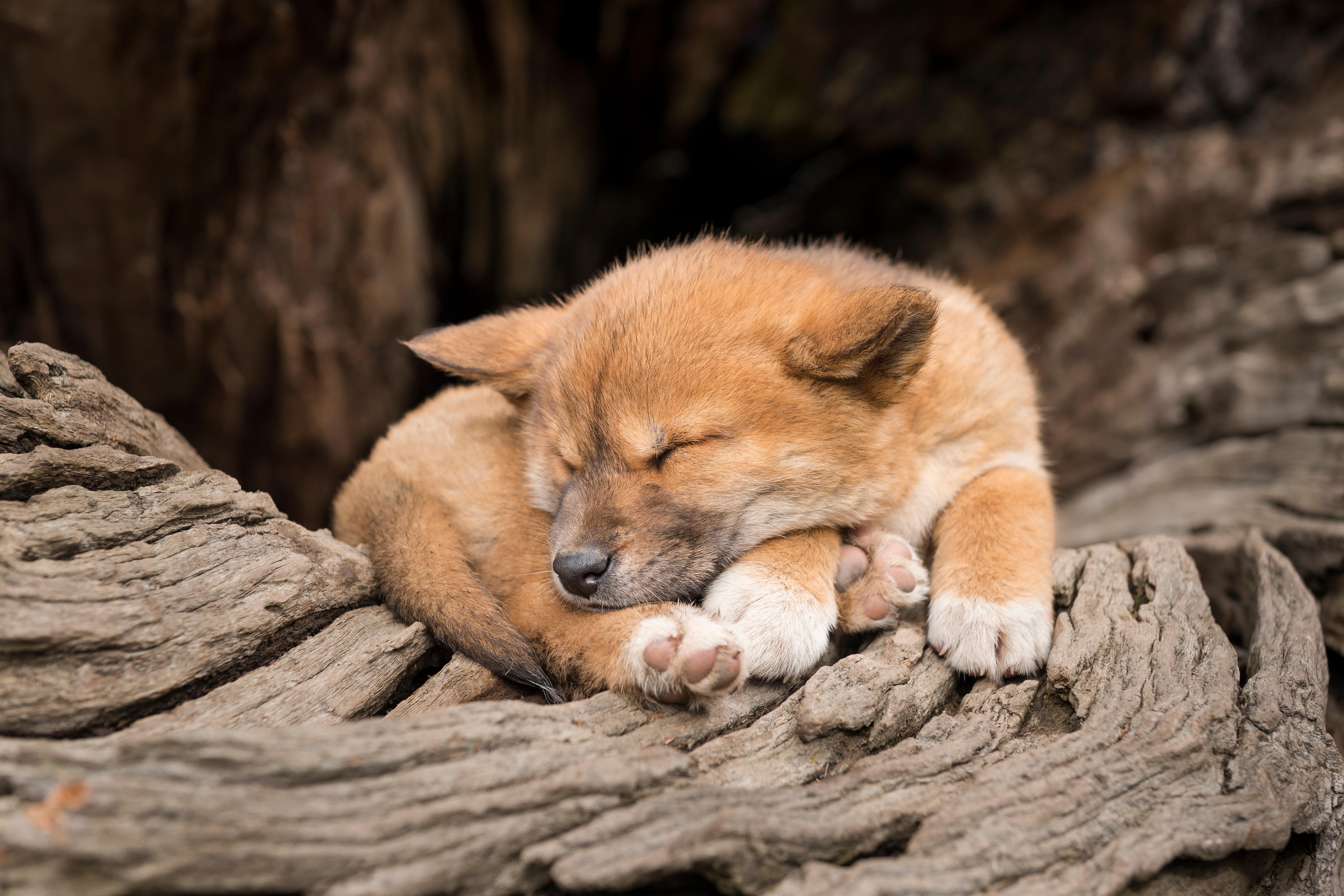 A young dingo puppy, Canis lupus dingo, falls asleep on an old tree trunk at a research center. ← Previous Next → MMF9DX A young dingo puppy, Canis lupus dingo, falls asleep on an old tree trunk at a research center.